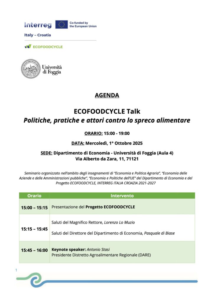 Foggia, 29 settembre 2025 – Mercoledì 1° ottobre 2025, dalle ore 15:00 alle 19:00 (Aula 4, Dipartimento di Economia, Via Alberto da Zara 11), l’Università di Foggia ospita l’ECOFOODCYCLE Talk – Politiche, pratiche e attori contro lo spreco alimentare, seminario promosso nell’ambito del progetto europeo ECOFOODCYCLE – Interreg Italia-Croazia 2021–2027.