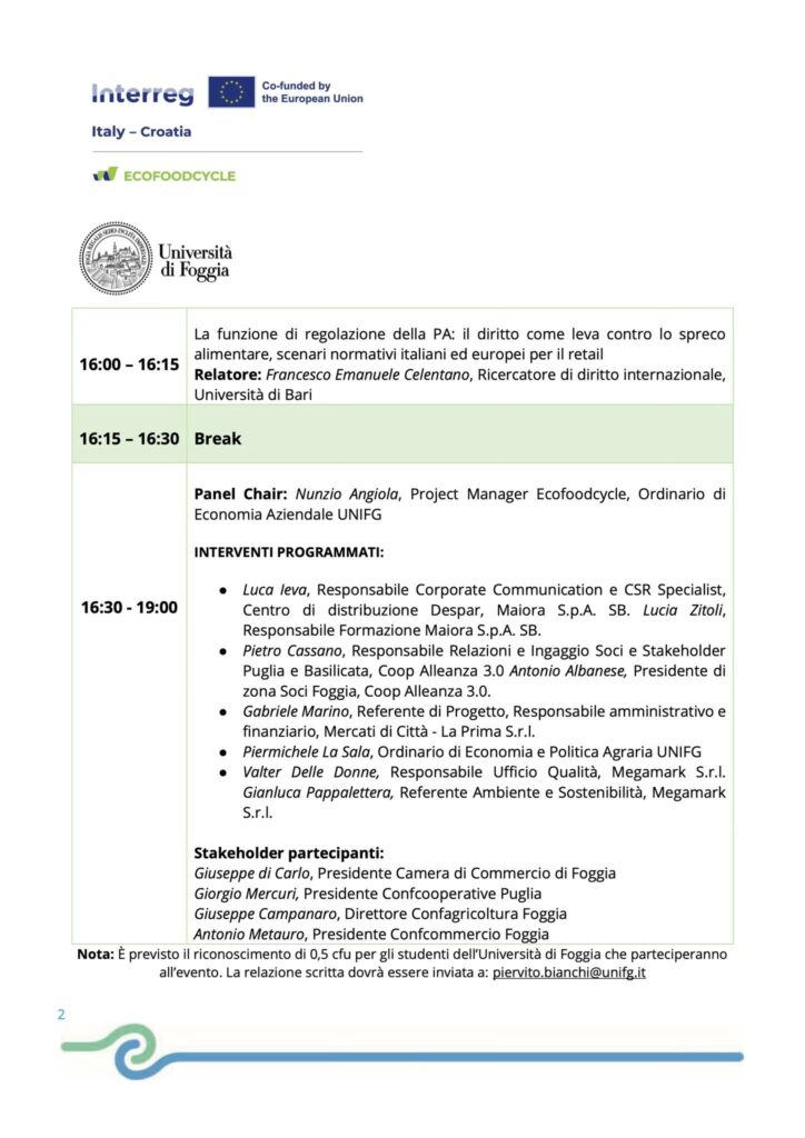 La sessione pomeridiana, coordinata dal prof. Nunzio Angiola, vedrà la partecipazione di rappresentanti di Maiora–Despar Centro Sud, Coop Alleanza 3.0, Mercati di Città, Megamark, insieme a docenti UNIFG e stakeholder territoriali tra cui Camera di Commercio di Foggia, Confcooperative, Confagricoltura e Confcommercio.